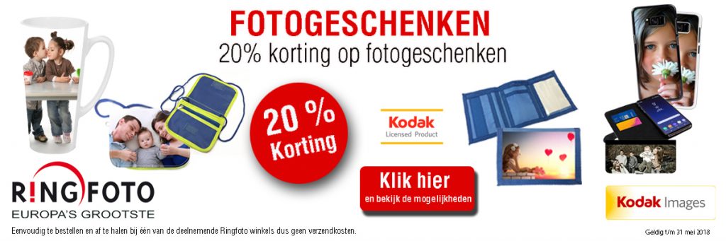We werken samen met diverse bedrijven om een nog beter assortiment aan te kunnen bieden. Kodak Photolitto heeft elke maand een leuke actie en deze keer is dat 20% korting op de fotogeschenken. Bij het bestellen kun je onze winkel kiezen om de order te laten bezorgen. Klik op de afbeelding om de website te bezoeken.